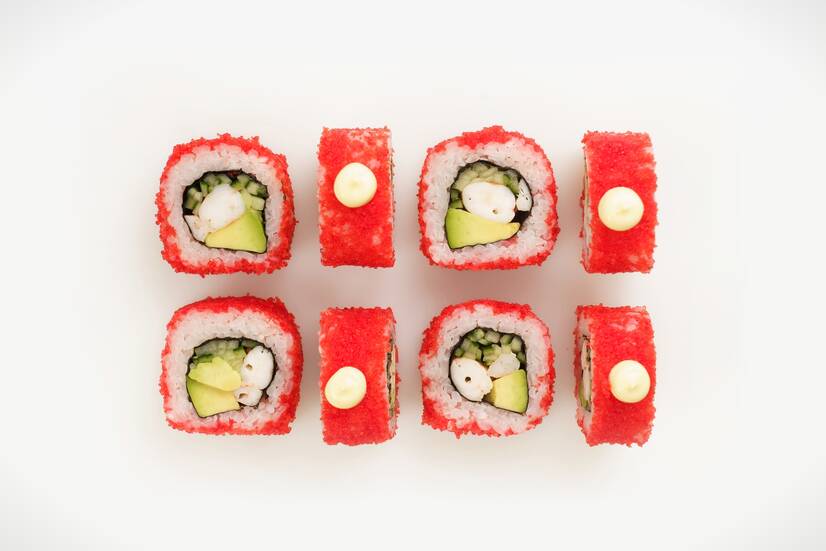 Тигрові креветки, авокадо, огірок, тобіко та японський майонез — апетитний рол із насиченим смаком і легкою морською ноткою.