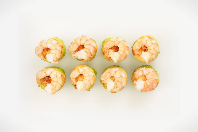 Тигрові креветки, сирний мікс, крем-сир, авокадо, тобіко і теріякі — апетитний запечений рол із гармонійним поєднанням ніжності та хрустких нот.