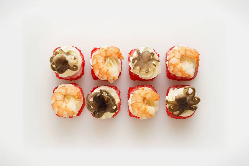 Ніжний крем-сир, тигрові креветки, восьминіг, огірок, лист салату, тобіко і ароматний соус теріякі — фірмовий рол із багатим і збалансованим смаком.