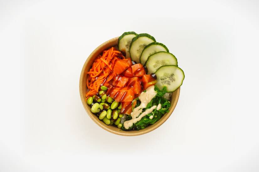 Рис із лососем, морквою, огірком, бобами едамаме та хіяші, заправлений соусами теріякі, шрірача і горіховим, посипаний кунжутом — легкий і насичений боул із різноманітними текстурами.