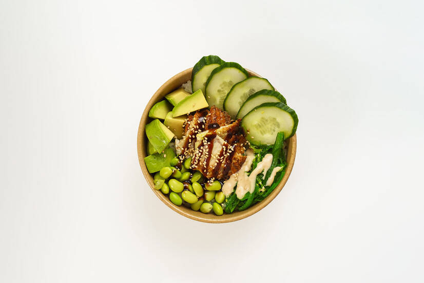 Рис із вугрем, авокадо, огірком, бобами едамаме і водоростями хіяші, соуси унагі та горіховий, кунжут — легкий та насичений боул із багатим поєднанням текстур і смаків.